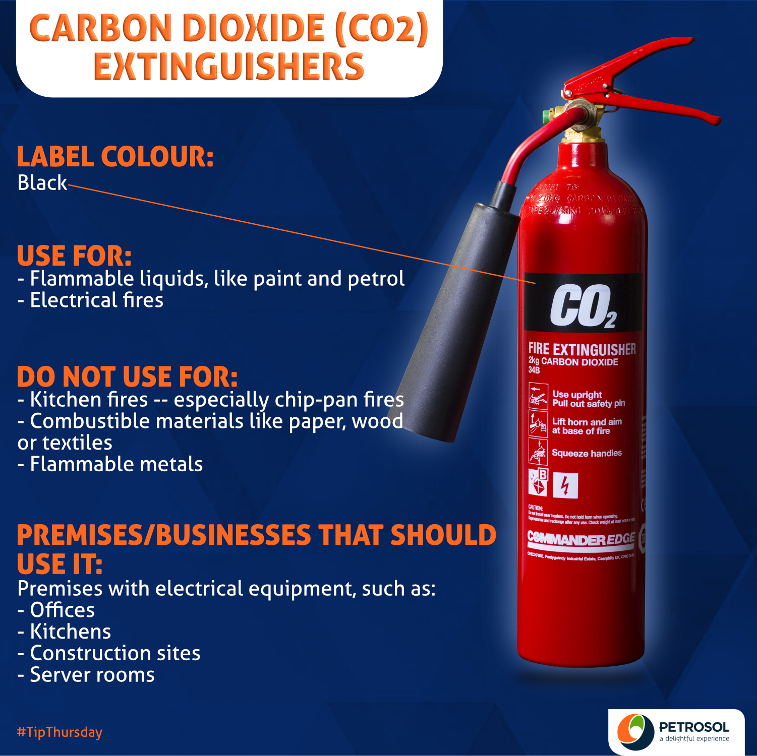 Understanding the Fire Extinguisher Types by Colors Carbon Dioxide Fire Extinguishers This type of extinguisher comes with a black label on the red body. You can identify it through texts like 'Carbon Dioxide' or CO2 written in white on a black label. The CO2 fire extinguishers are suitable for combating class B and E fires. It works perfectly on flammable liquids and electrical fires.